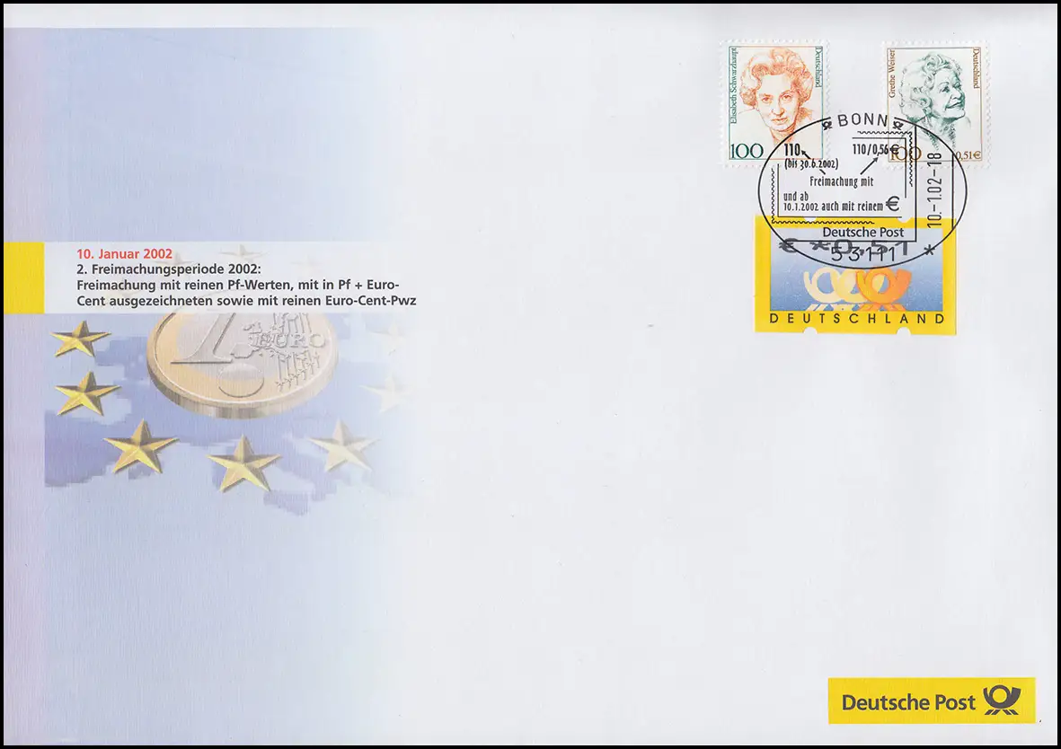 Documentaion "Introduction euro": Lettre de bijoux de 3 valeurs: DM-valeurs, avec des signes de valeur en euros doubles et purs et des timbres spéciaux BONN "...Libération à partir du 10.1.2002 également avec les euro-marques pures 10.01.02" Examen: original Référence produit: 00000000012443