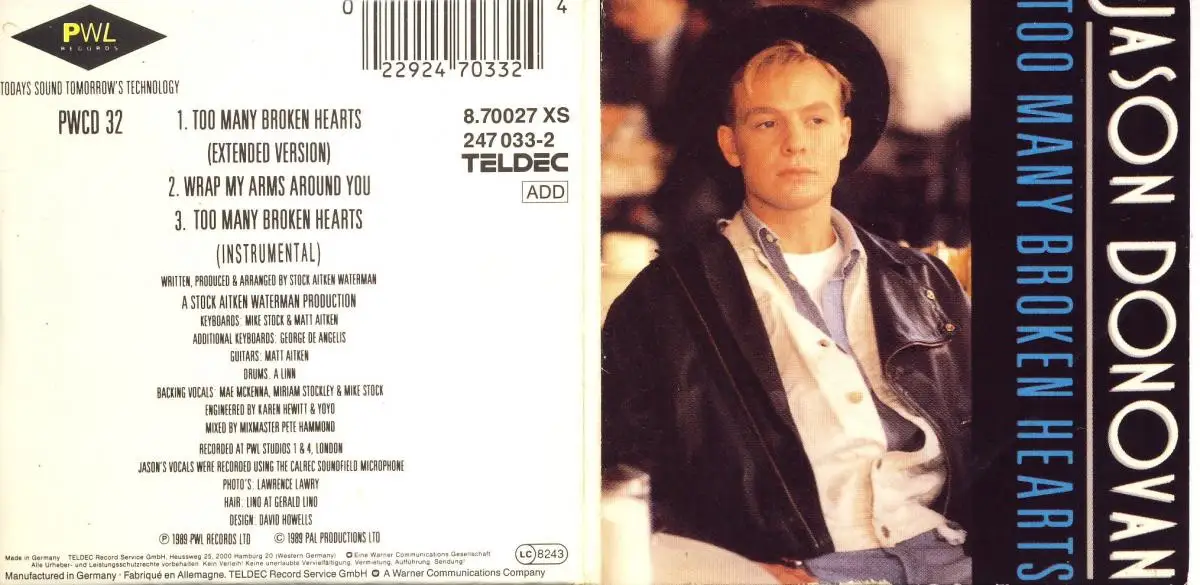 CD Single Jason Donovan - Too Many Broken Hearts, 3" CD, couverture pliante; Stock / Aitken / Waterman, état CD VG+ housse M-; Fabriqué en Germany 1989 PWL Records 8.70027 XS, 247 033-2, Tracks [Ext. Verset.] 5:45, Wrap My Arms Around You 3:40, [Instr. 3:28