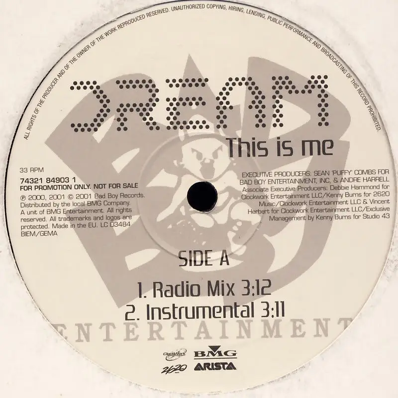 12" Maxi Dream - This Is Me, Promo, Couverture neutre, État Platte VG+; Fabriqué en Europe 2001 Bad Boy Entertainment 74321 84903 1, Tracks [Radio Mix] 3:12, [Instr. 3:11,[Radio Mix ] 3:12: [Intr.]