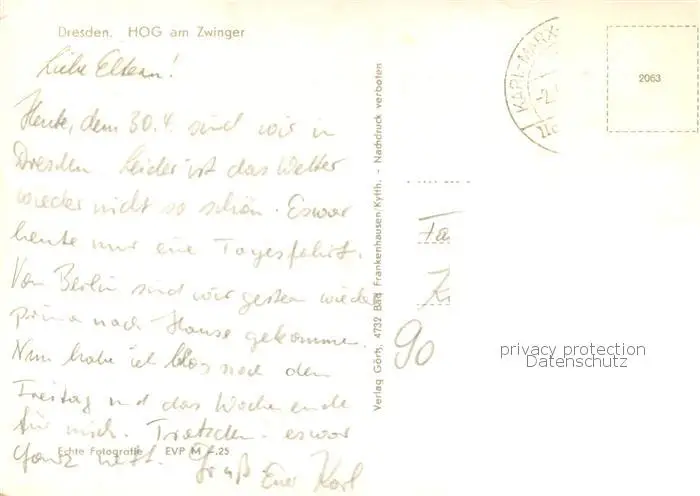 Dresden HOG am Zwinger Dresden postalisch gelaufen nach 1965 Erhaltung siehe scans [WerneD78] WernPID7