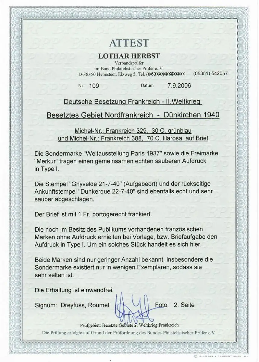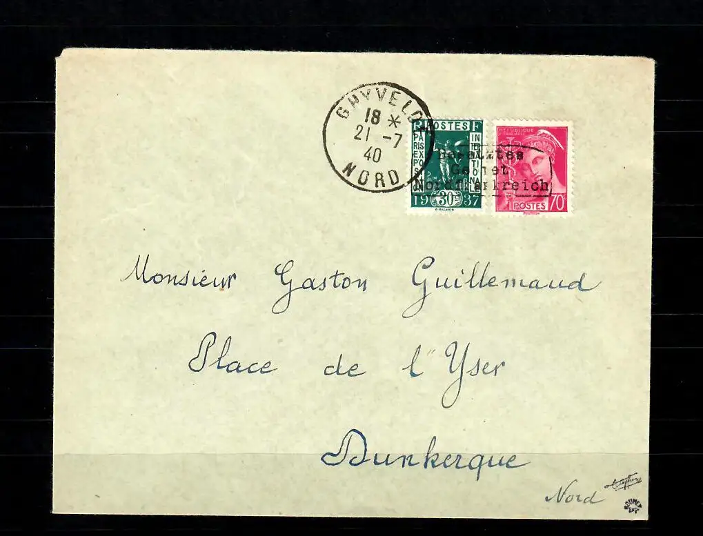 Dt. Instrumentation France Mi n° 329, 388 sur lettre Ghyveide, Dunkerque BPP Attest