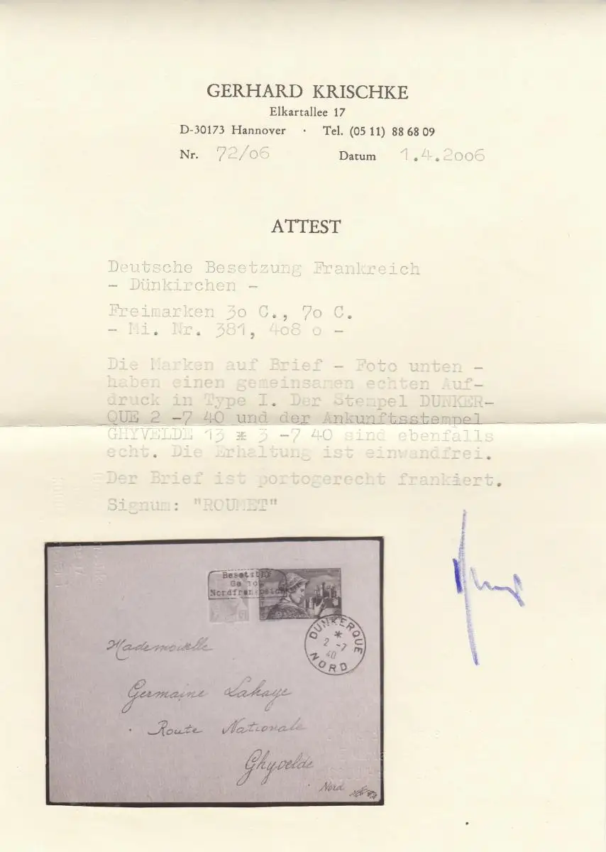 Dt. Instrumentation France: numéro 381, 408, par lettre 1940 Dunkerque, Krichke