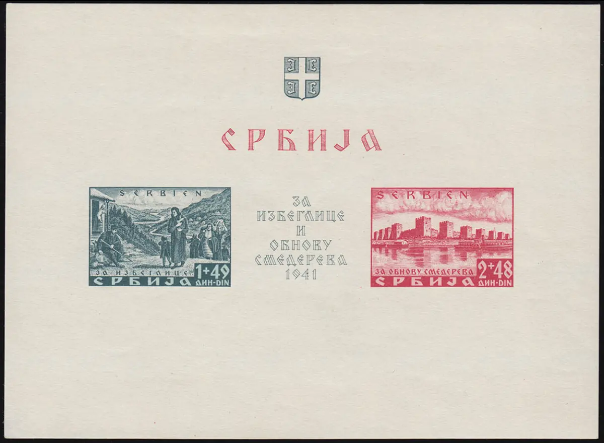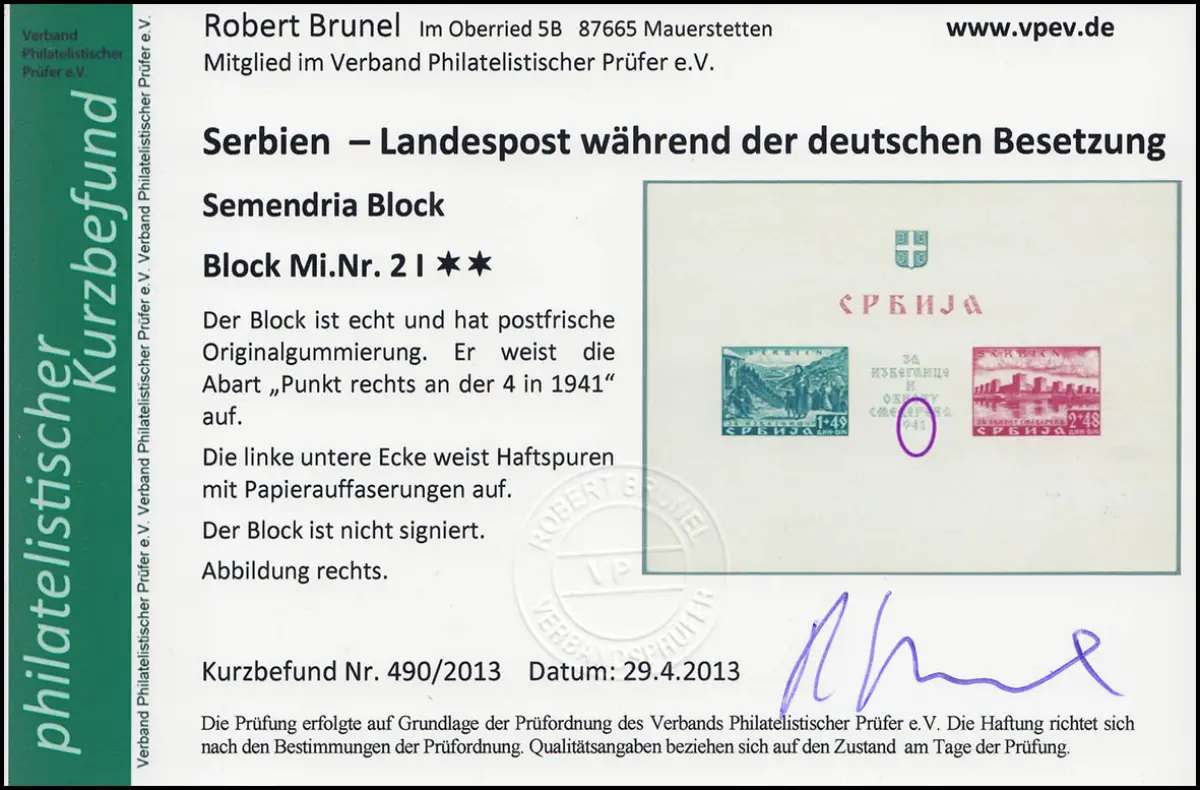 Seltener Semendria-Block 2 mit postfrischer Originalgummierung mit Plattenfehler I Punkte an der 4 in Blockmitte. Der Block zeigt alters- und herstellungsbedingte kleine Auffälligkeiten wie kleinere Haftstellen und Verfärbungen (siehe Befund), die bei dieser Ausgabe durchaus handelsüblich sind.