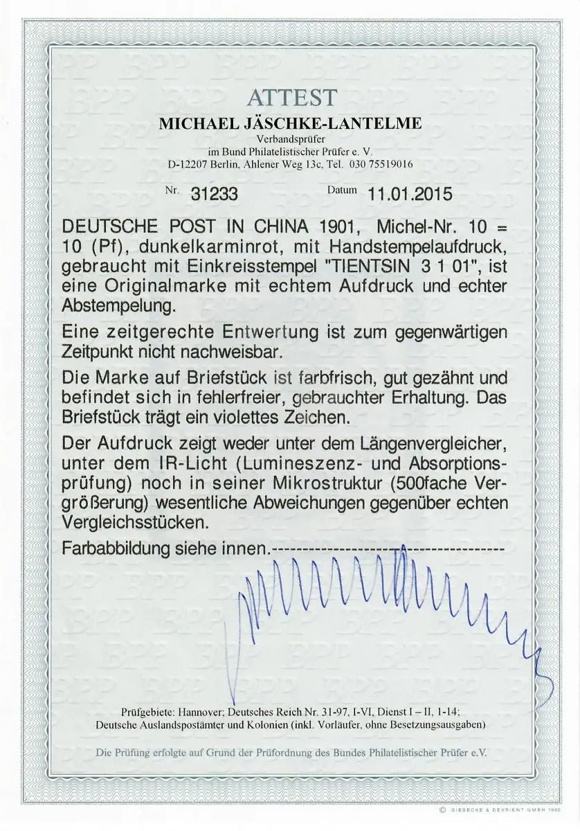 Dt. Post en Chine: Min. 10, Tientsin 1901 cacheté, BPP Attest