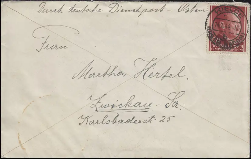 Par le bureau de poste allemand 78 Freizemark 24 Gr EF Bf. KIELCE 14.1.44 vers Zwickau