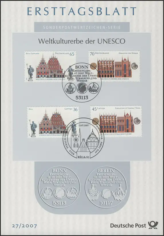 ETB 27/2007 UNESCO, Riga, Stralsund, Wismar, Hôtel de Ville - avec édition Lettonie