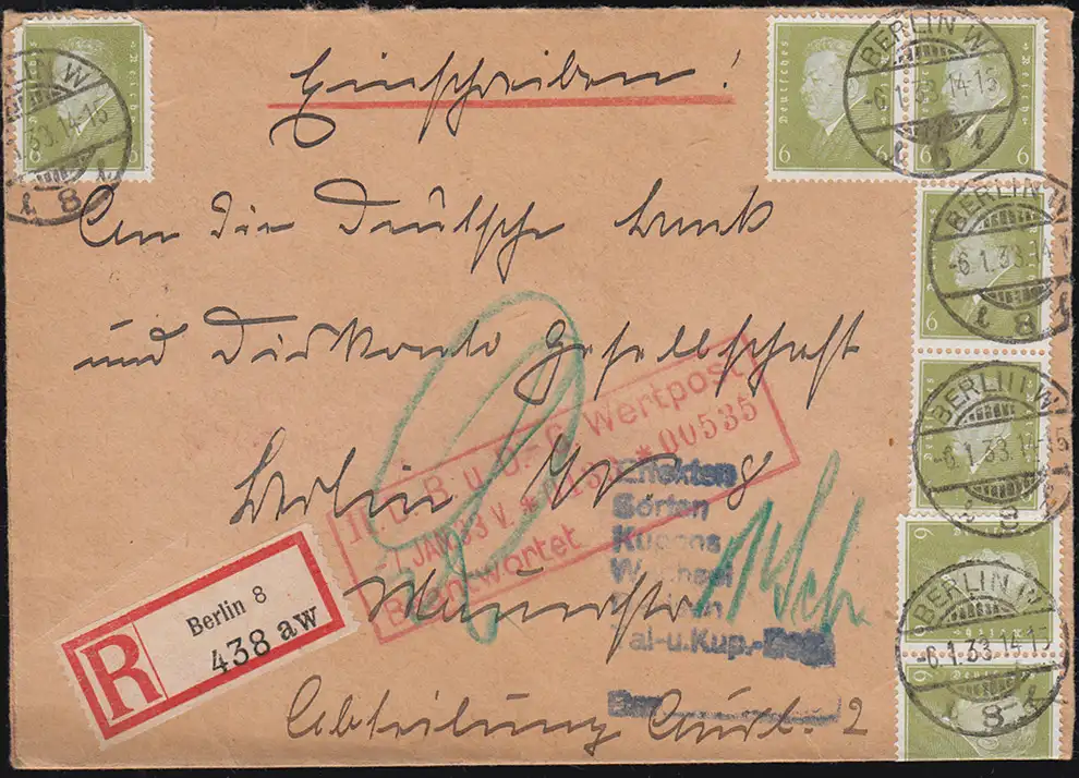 Service postal Berlin W8 en lettre recommandée à la Deutsche Bank BERLIN W8, - 6.1.33, enveloppe scellée, rare pliable multiple, deux marques cassées selon les besoins selon la figure Numéro de catalogue: 465 Examen: original Référence produit: 00000000034997>Remarque: Cet article n'est disponible qu'une seule fois. Vous recevrez exactement l'article représenté.