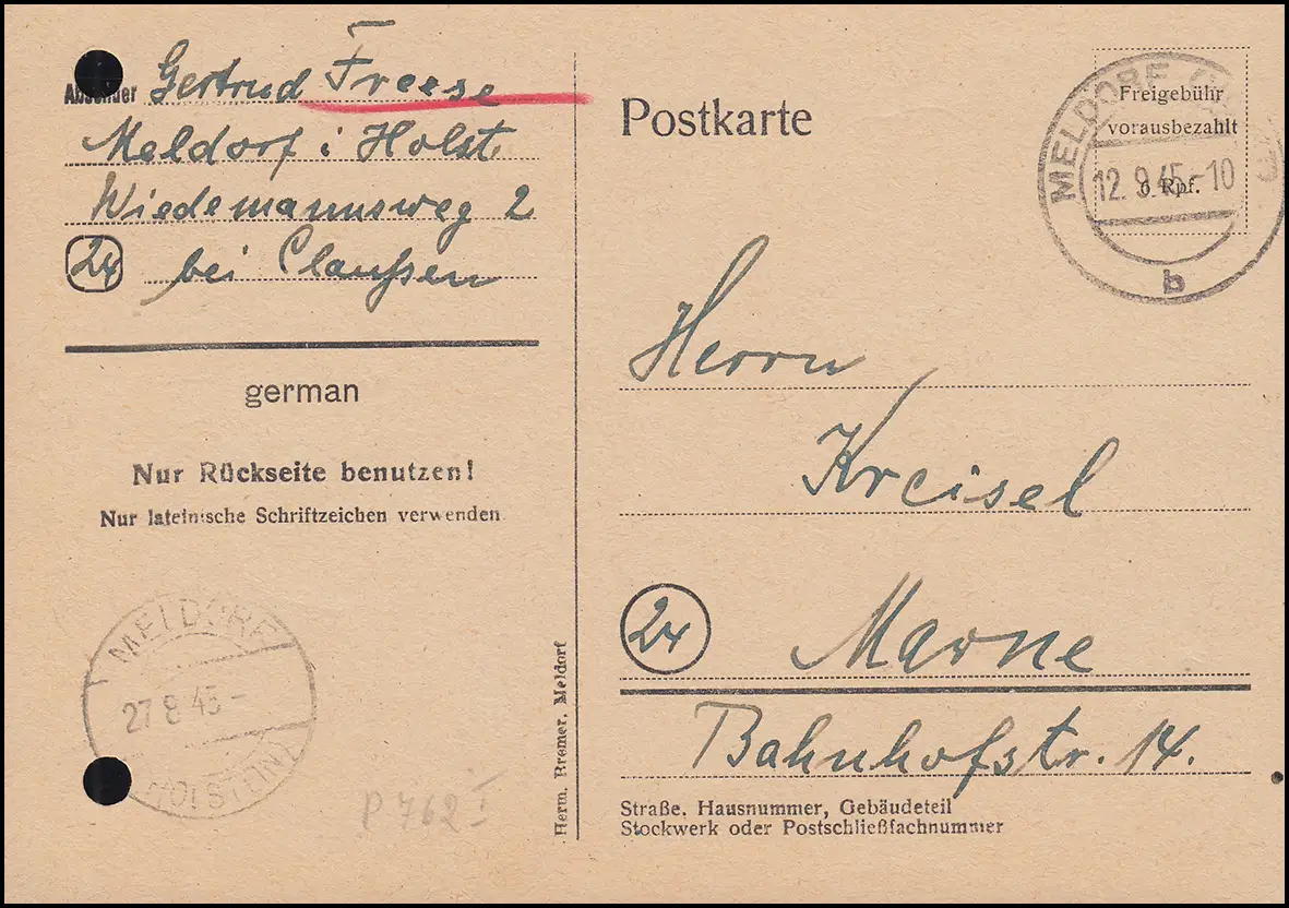 Behelfsausgabe P 762I von MELDORF (27.8.45) 12.9.45 nach Marne - Flüchtlinge