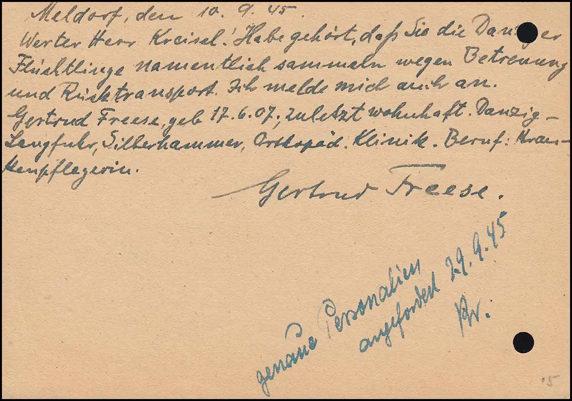 Behelfsausgabe für die Britische Zone: Als Postkarte von Meldorf (Holstein) nach Marne zwecks Betreuung und Rückführung von Flüchtlingen nach Danzig - Historisches Zeitdokument! Bedarfsmäßige Aktenlochung laut Abbildung.