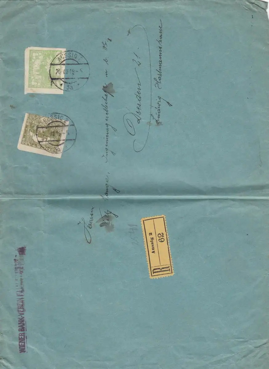 Lettre recommandé Aussig 1919 a Dresde, Wiener Bank Verein