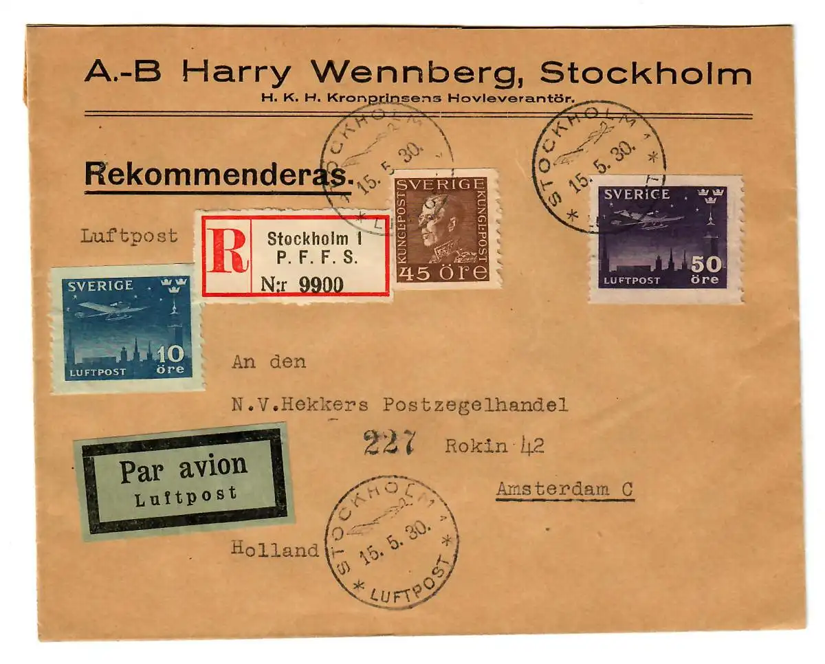 Poste aérien recommandé Stockholm vers Amsterdam 1930.