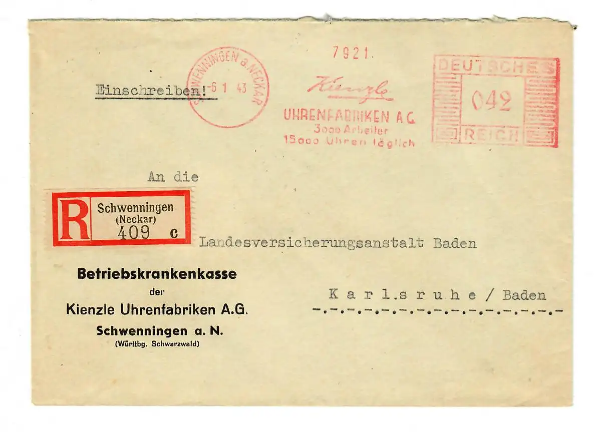 Inscrivez-vous Schwenningen/N, Kienzle Horlogenfabrik après Karlsruhe 1943