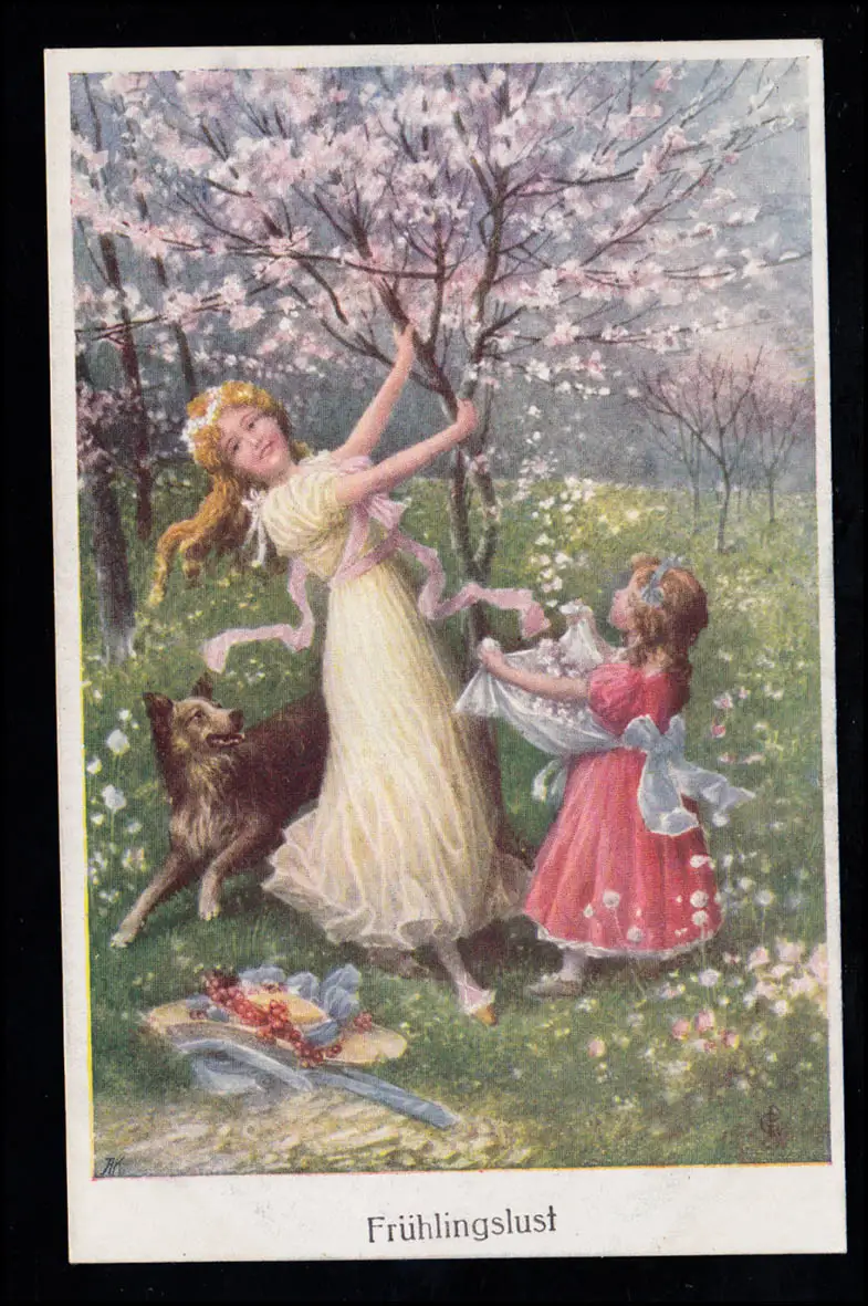 Enfants-AK Désir de printemps: Deux filles avec chien à la récolte des fleurs, inutilisé