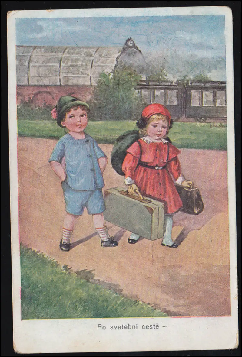 Enfants-AK Fille et garçon avec bagages - Après la lune de miel, 20.1919