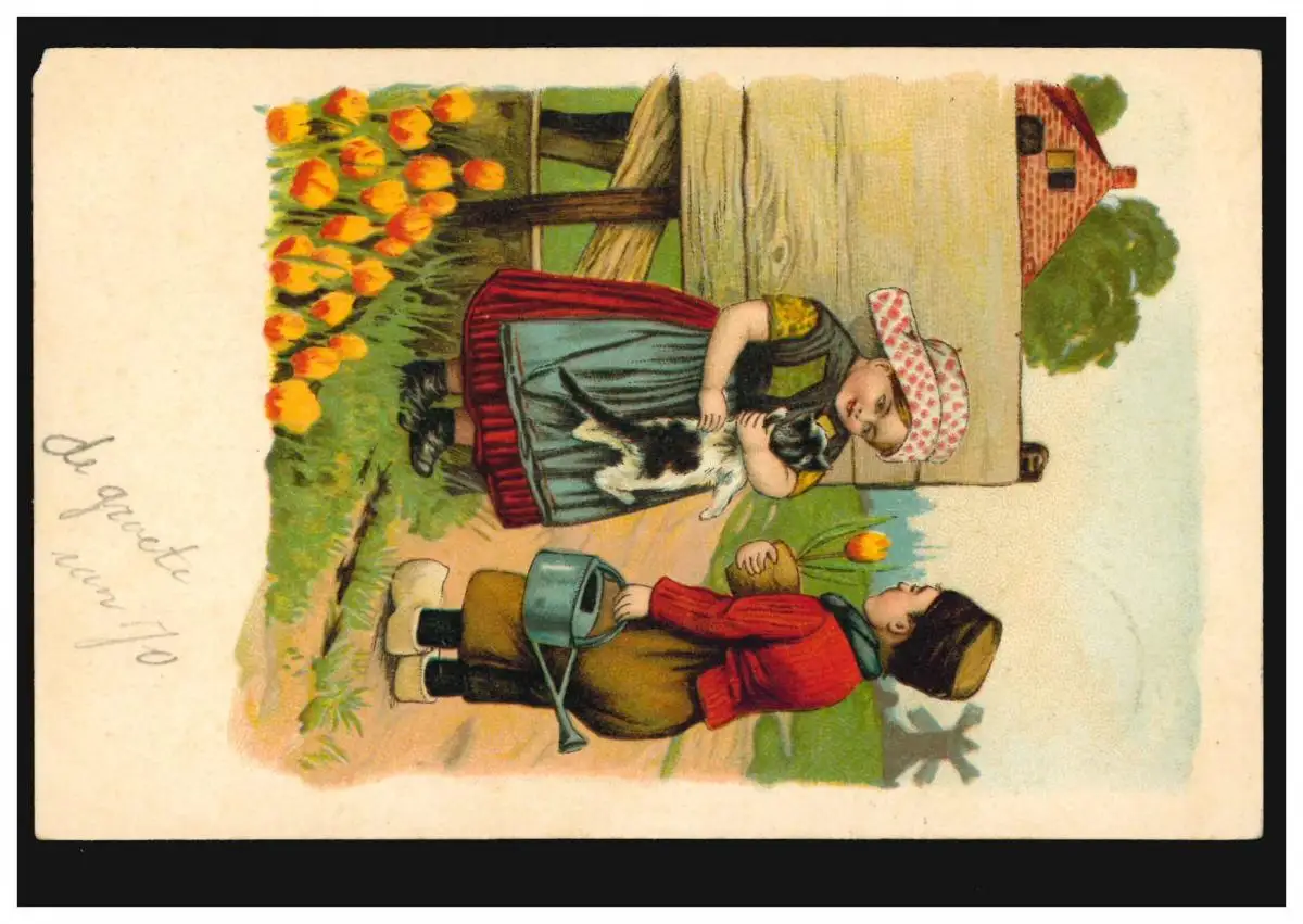 Enfants AK animaux en costumes avec tulipes et chat, éTÉGÉNÉBOCH 1904