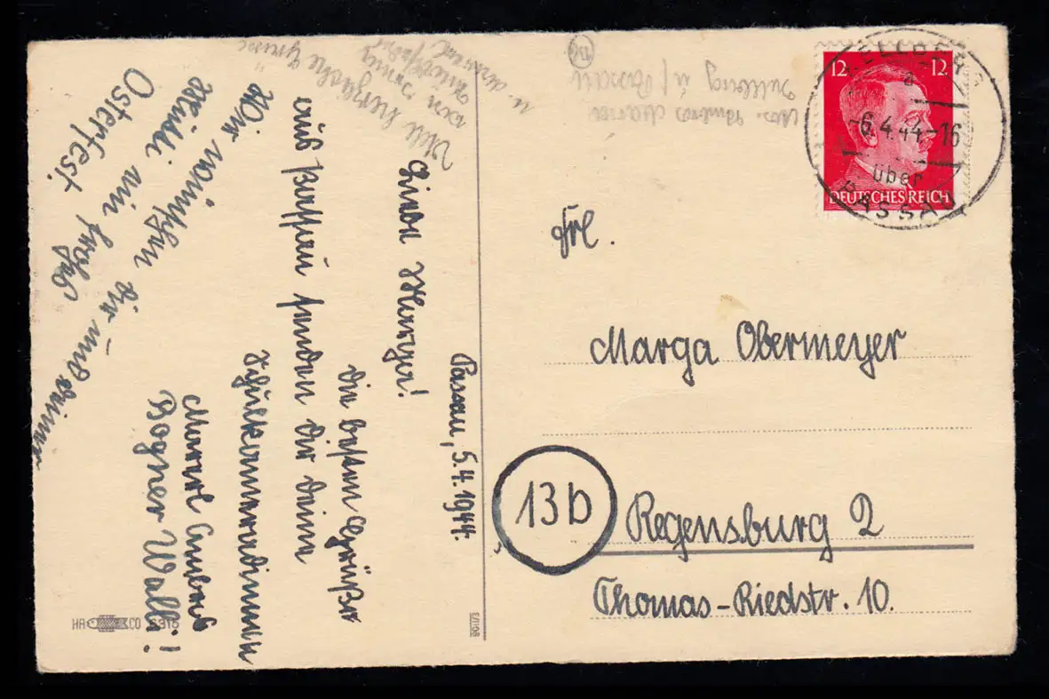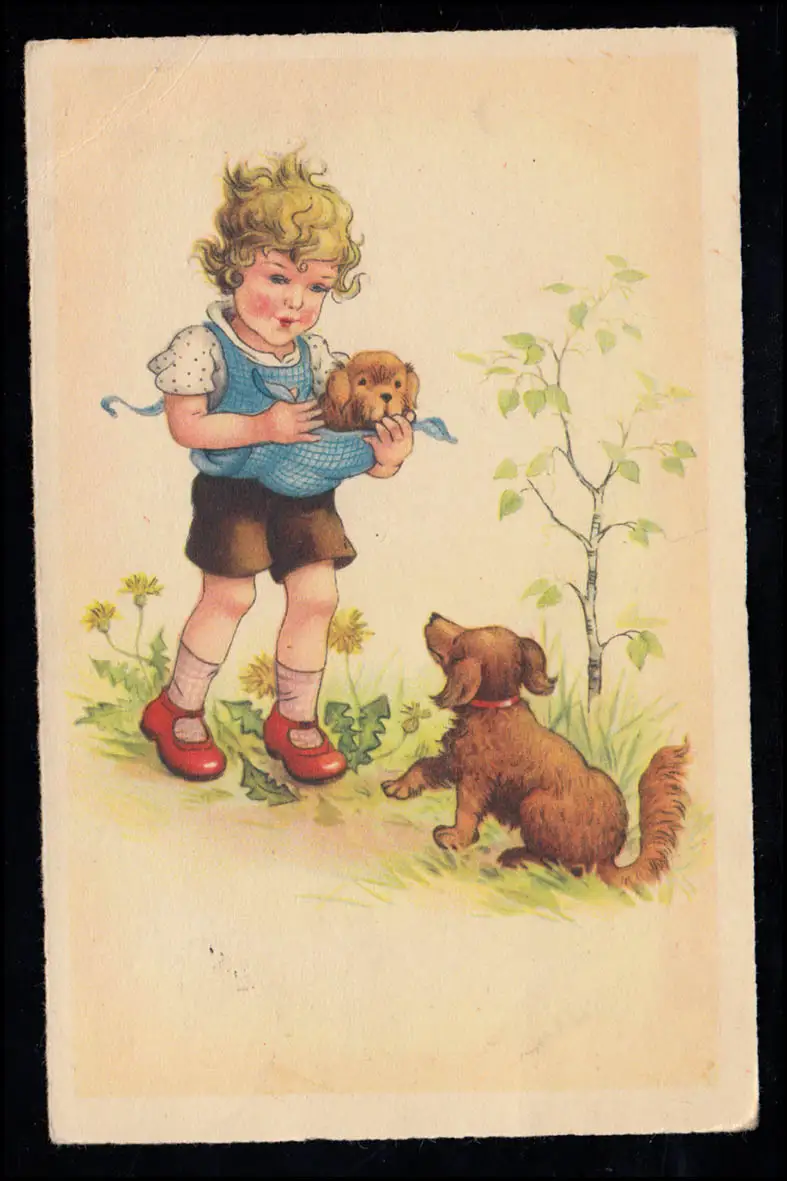 Enfants-AK garçon avec deux chiens dans la prairie, KELLBERG via PASSAU 6.4.1944