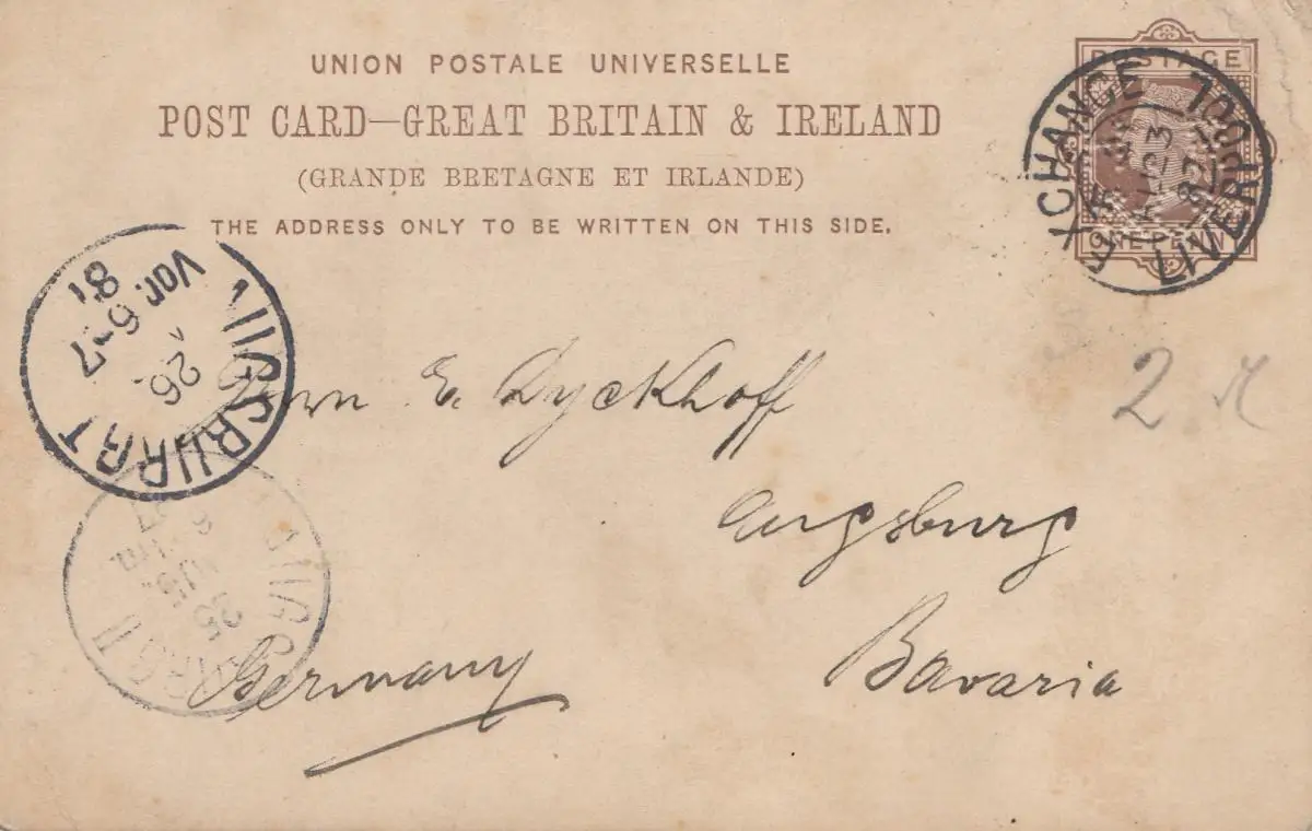 Angleterre: 1887: Tout à fait - Liverpool vers Augsburg - Perfin