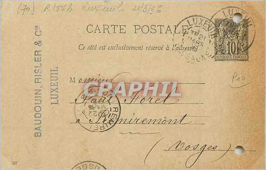 Entier Postal 10cSage Foret pour Remiremont 1896 cad Luxeuil