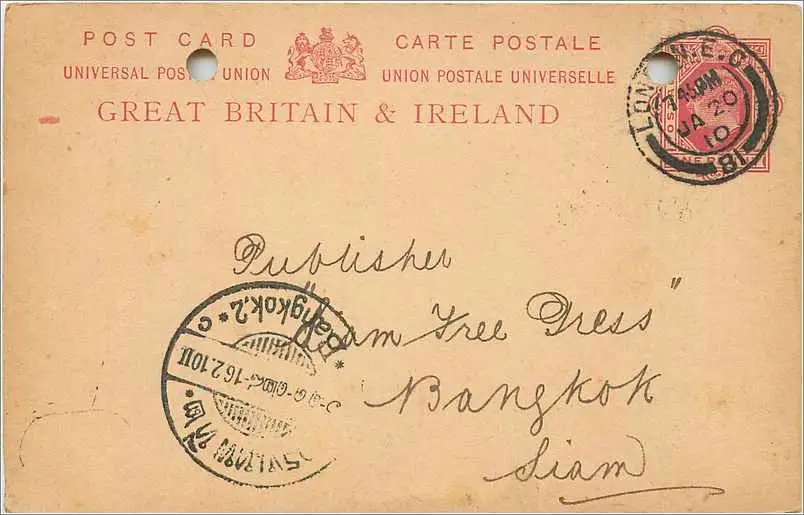 Entier Postal Stationary 1p 1910 London for Bangkok Thailand