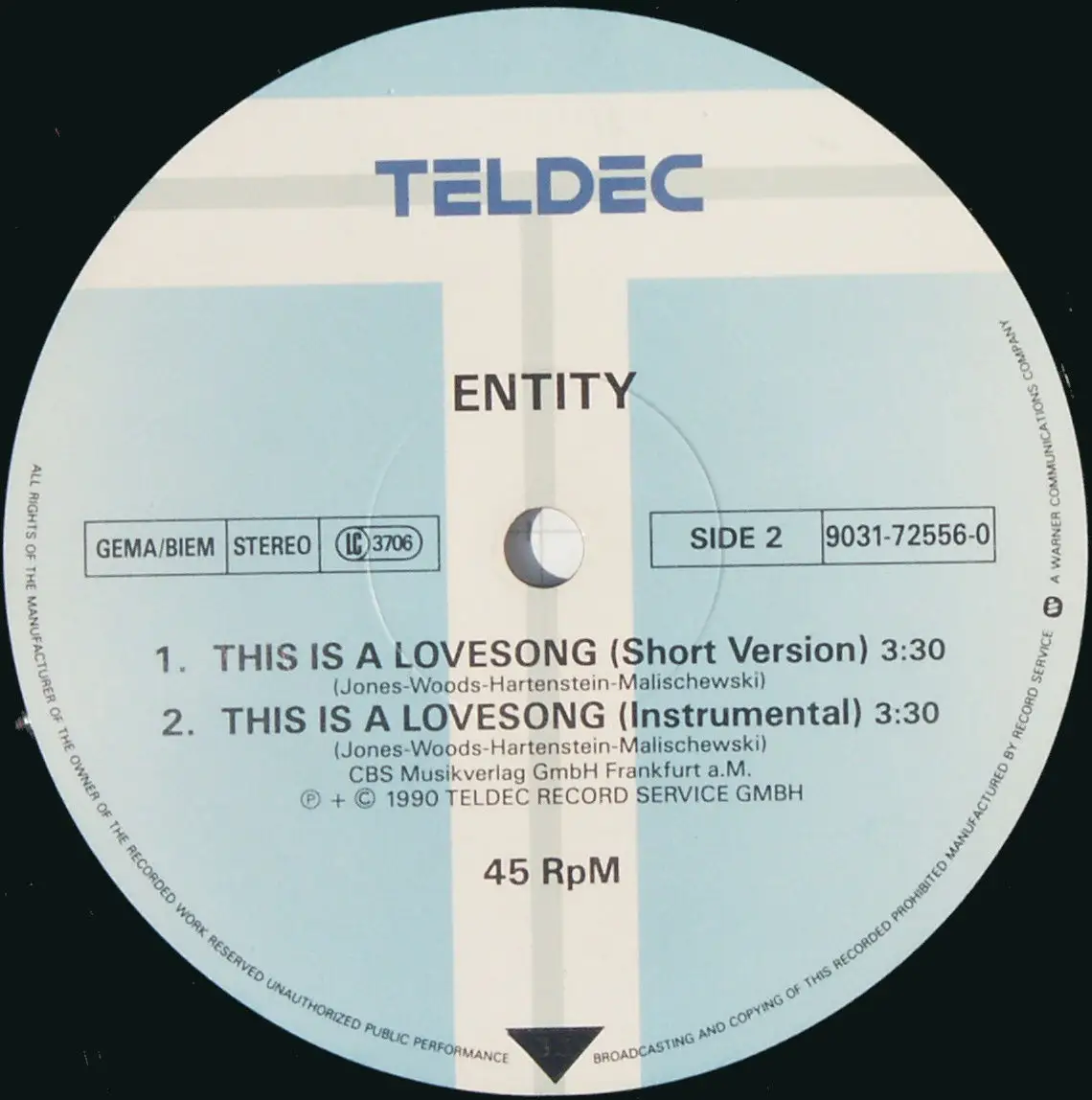 12" Maxi Entity - This Is A Lovesong, couverture neutre, état disque VG+; Fabriqué en Allemagne 1990 Teldec 9031-72556-0, Tracks [Ext. Verset] 4:30, [Short Vers.] 3:30 [Instr. verset. 3: 30]
