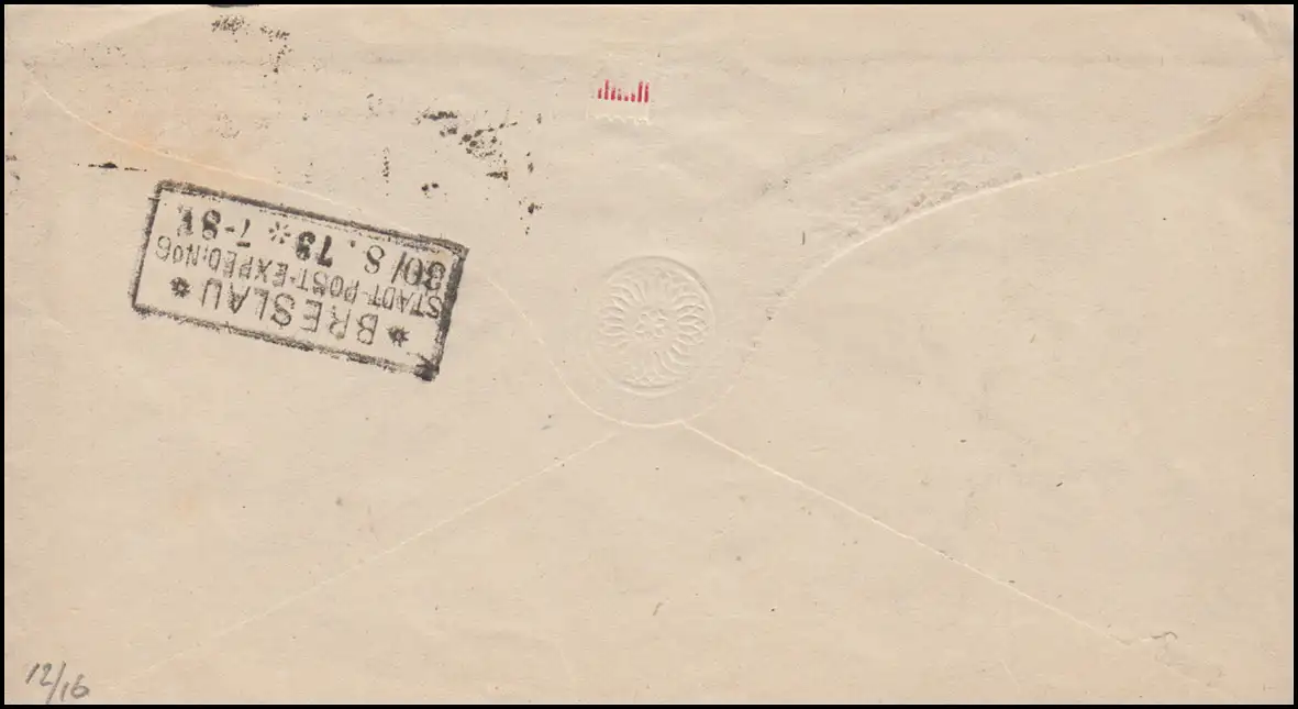 Enveloppe U 5 AII Tampon de poitrine PETERSDORF 29.8.1873 vers BRESLAU