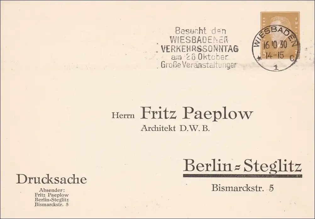 Enveloppe complète: impression de Wiesbaden à Berlin en 1930