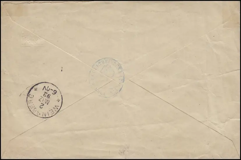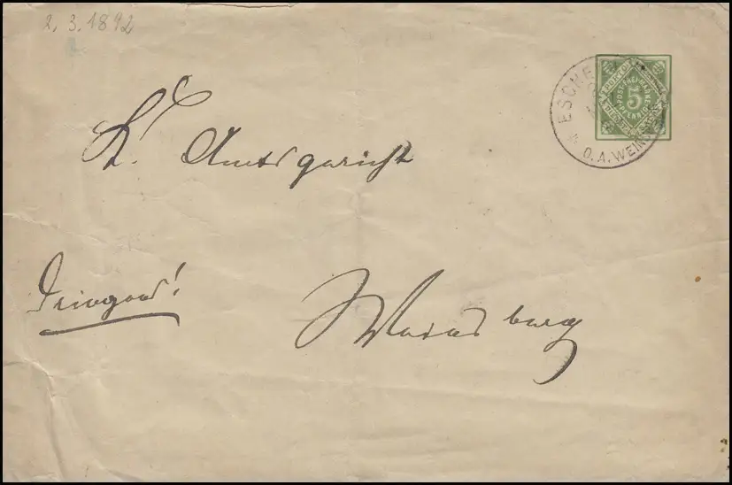 Enveloppe de service 5 Pf. vert Schulthessenamt ESCHENAU O.A. WENSBERG 2.3.92
