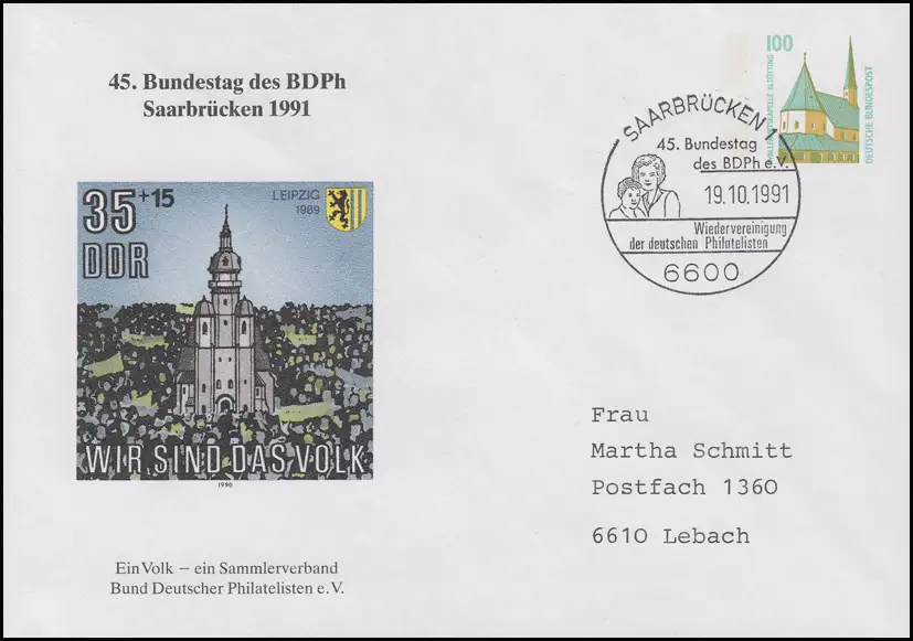 Enveloppe privée Un peuple - une association de collectionneurs SSt Sarrebruck Bundestag 19.10.91