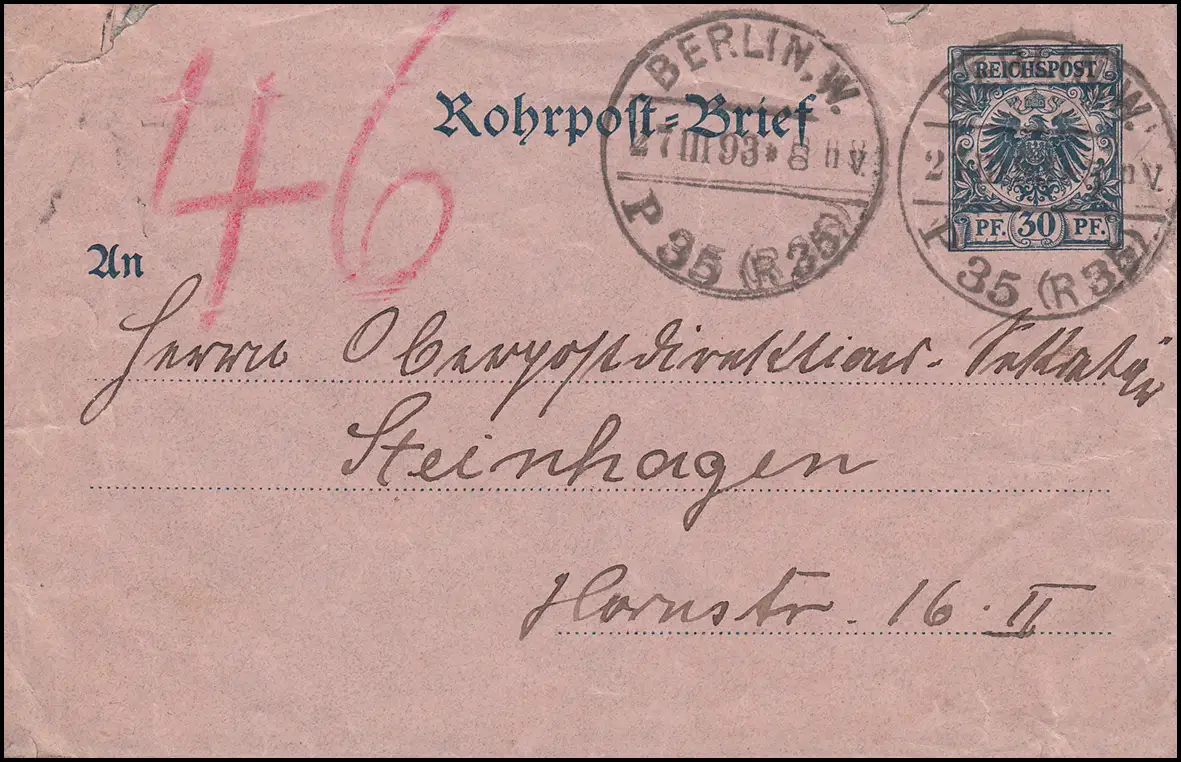 Enveloppe tube-post RU 3 Adler BERLIN 27.3.93 P 35 (R35) n. bertIN 2.3. P 46 ( R18)