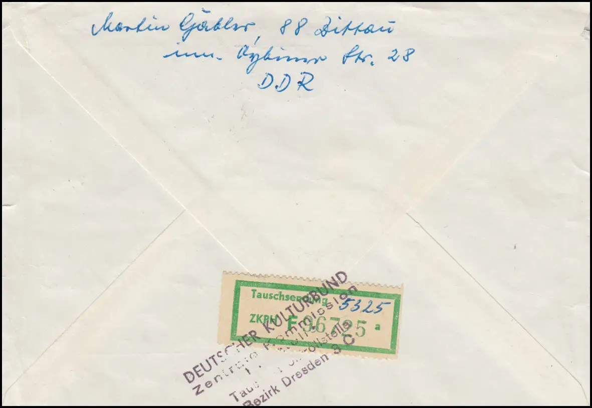 Envoi d'échange de la RDA vers la République fédérale d ' Allemagne: autocollant vert avec cachet DEUTSCHER KULTUREBUND - bureau de contrôle d\' échange District Dresde N° de catalogue: 1083 Vérification: original Numéro dÂ' article: 0000000003549>p>Remarque: Cet article n'est disponible qu'une seule fois. Vous recevrez exactement l'article représenté.