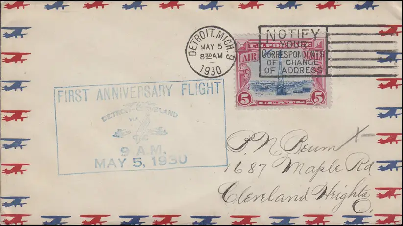 Premier vol Tampon Detroit - Cleveland 5.5.130, EF sur lettre De Troit 5.5.30