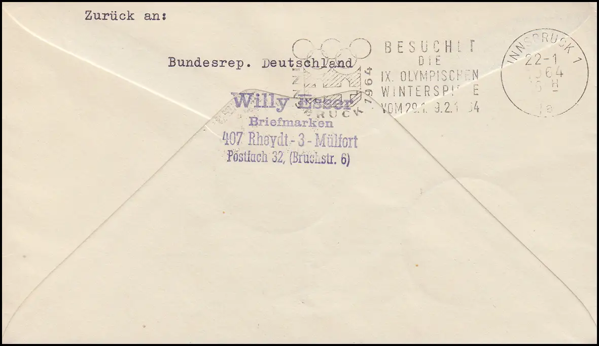 Austrian Airlines: impression par air avec cachet publicitaire olympique: INVEST LES IX PIELS OLYMPIQUES DE WINTERSBRUCK 21.1.64 et le cachet d'arrivée INNSBruCK 22.1.63.