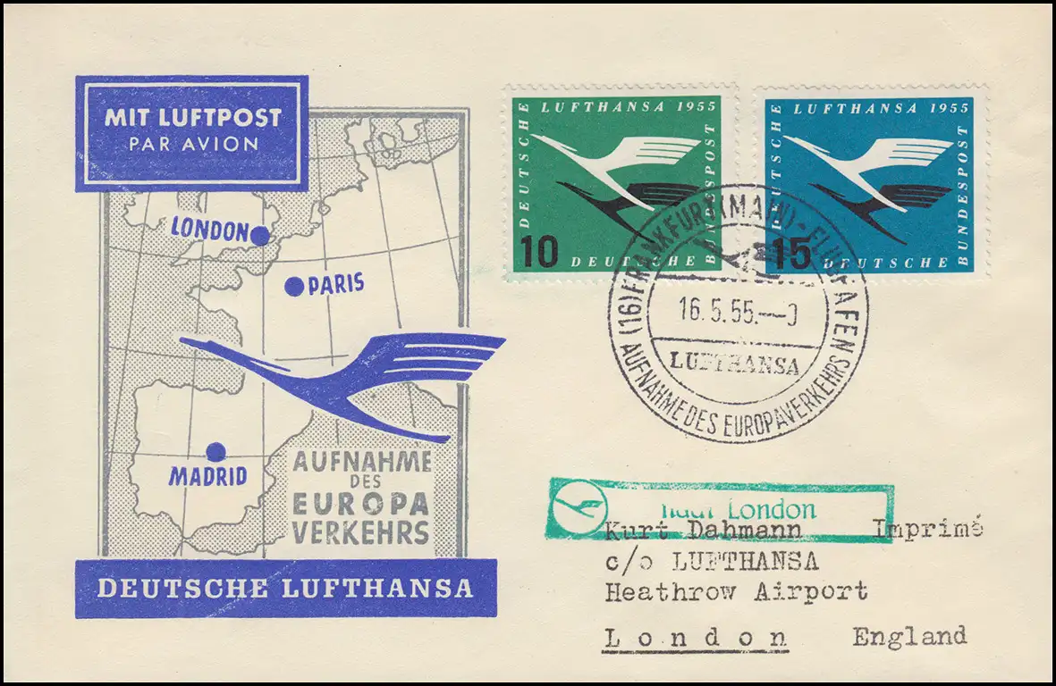 Lettre de bijoux portant le cachet vert " [Cran de Chansa aérienne] à Londres," cachet spécial FRANKFURT (MAIN) - AÉROPORT DE L'EUROPE AERONAUTIQUE 16.5.55 Numéro de catalogue: 206+207 Vérification: original Numéro d'article: 00000000036145>p>Remarque: Cet article n'est disponible qu'une fois. Vous recevrez l'élément représenté avec précision.