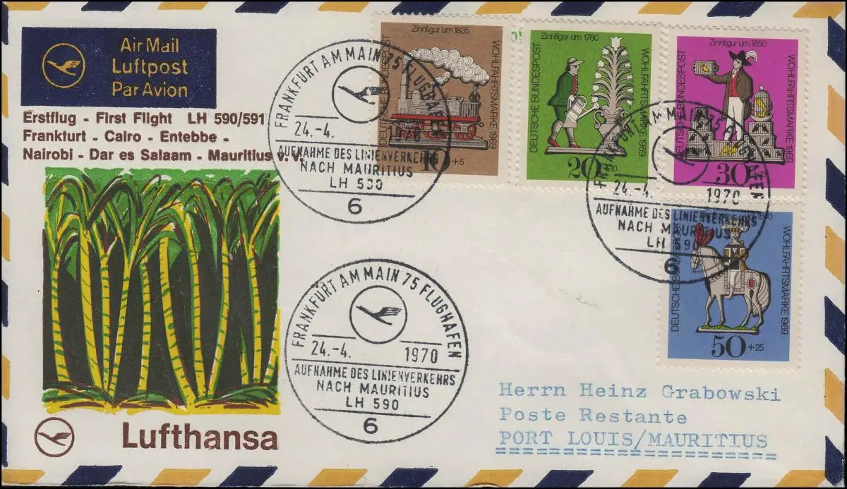 Premier vol Lufthansa LH 590/591 Francfort-sur-le-Main/Port Louis Maurice 24/25.4.1970