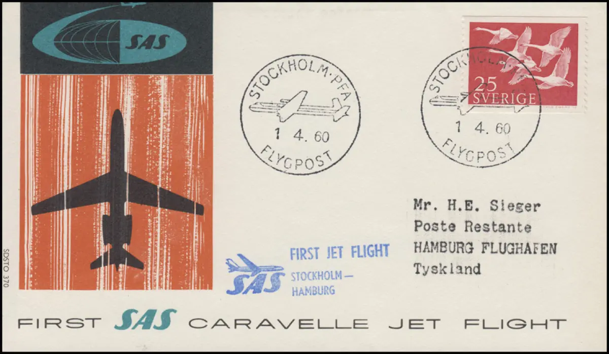 Vol initial SAS Caravelle Jet Flight Stockholm - Hambourg STOCKHOLM FLYGPOST 1.4.60