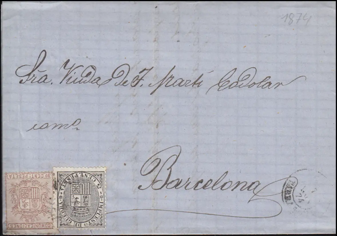 Espagne 145A Armoiries avec timbre d'impôt de guerre ZA 1 Lettre Valencia n. Barcelona 1874
