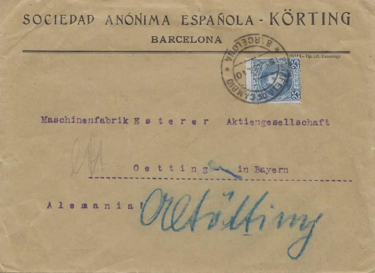 Espagne: 1910: Lettre de Barcelone à Oetting