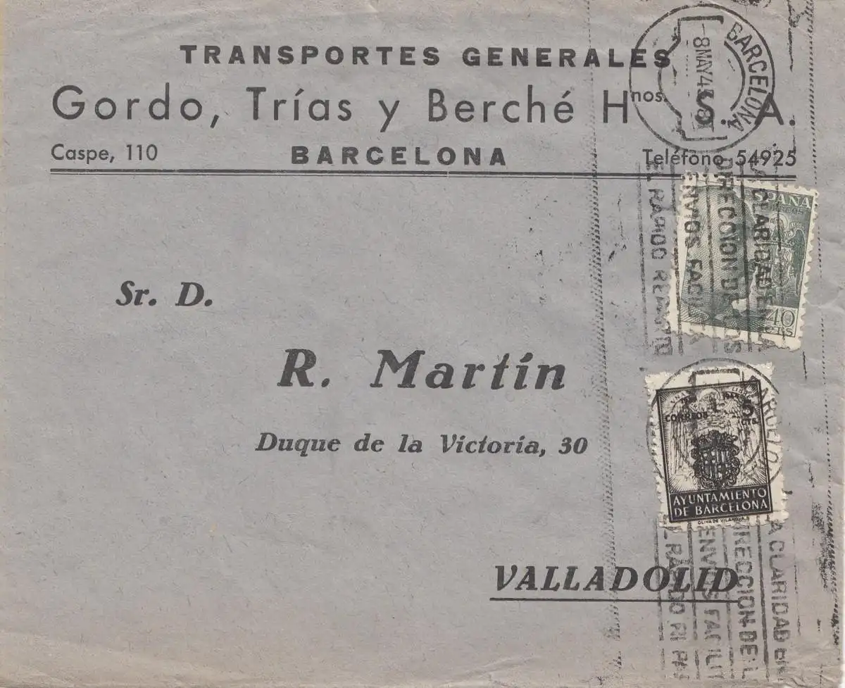 Espagne: 1945: Lettre de Barcelone à Valladolid