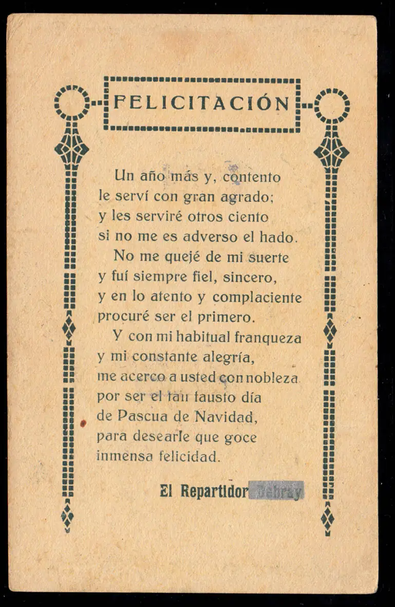 verso: Poème Félicitations du facteur / Felicitation - El Repartidor Examen: original Référence produit: 00000000036130>Note: Cet article n'est disponible qu'une seule fois. Vous recevrez exactement l'article représenté.