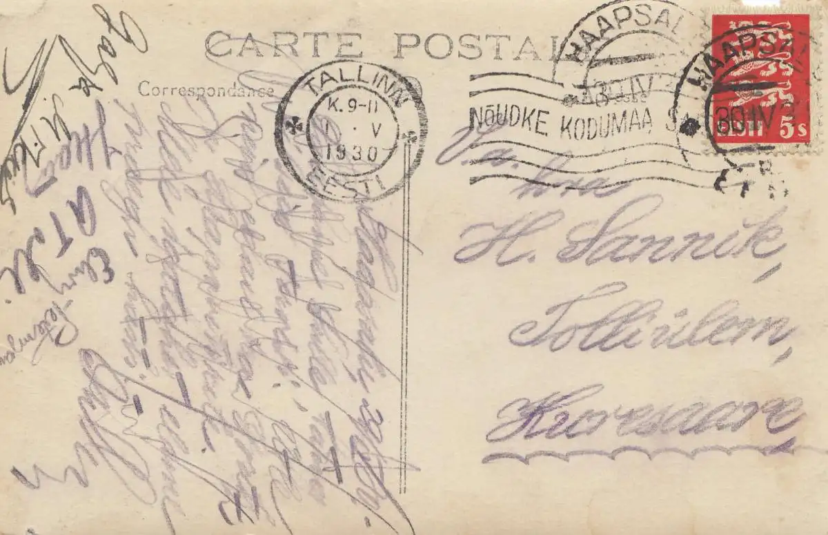♥Vaade et-sadamasse Haapsalu ., c'est-à-dire vue sur le port de Hapsalu. (vaade=Blick, sadam = port). Seulement ce que le U signifie je ne sais pas, car il ne forme pas un terme courant avec sa Adam. voir examen de numérisation: original Numéro d'article: 00000002001758