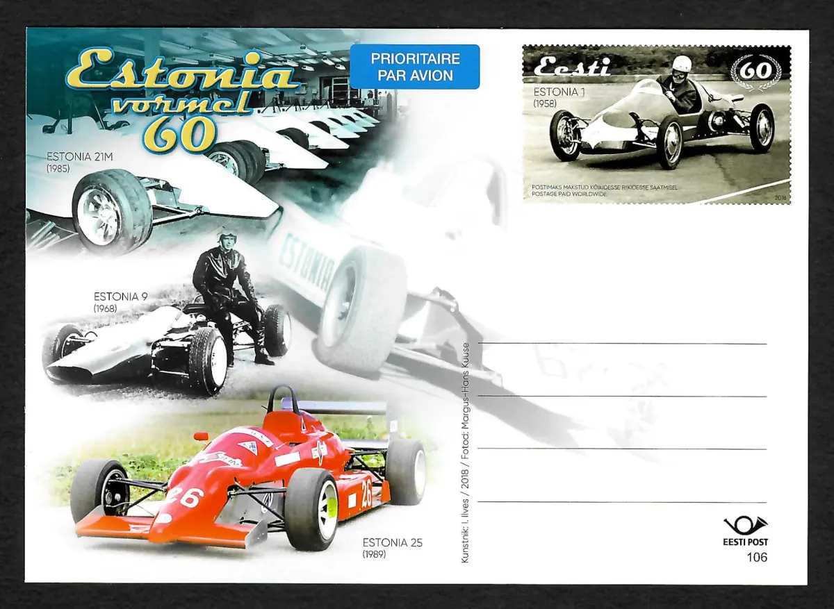 Estland 2018: Estnische Rennwagen, Entire #106, Rückseite Schnittzeichnungen