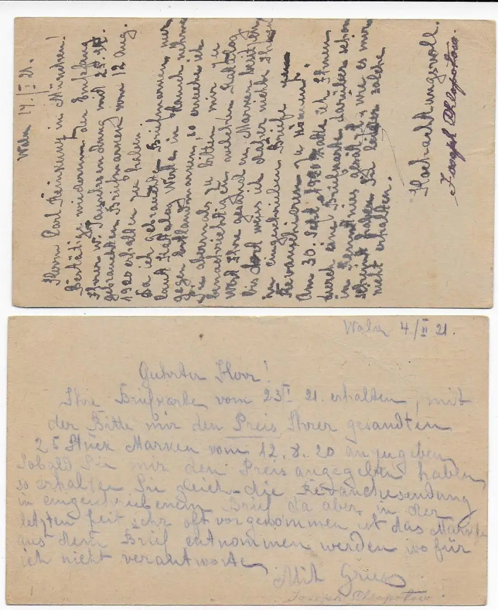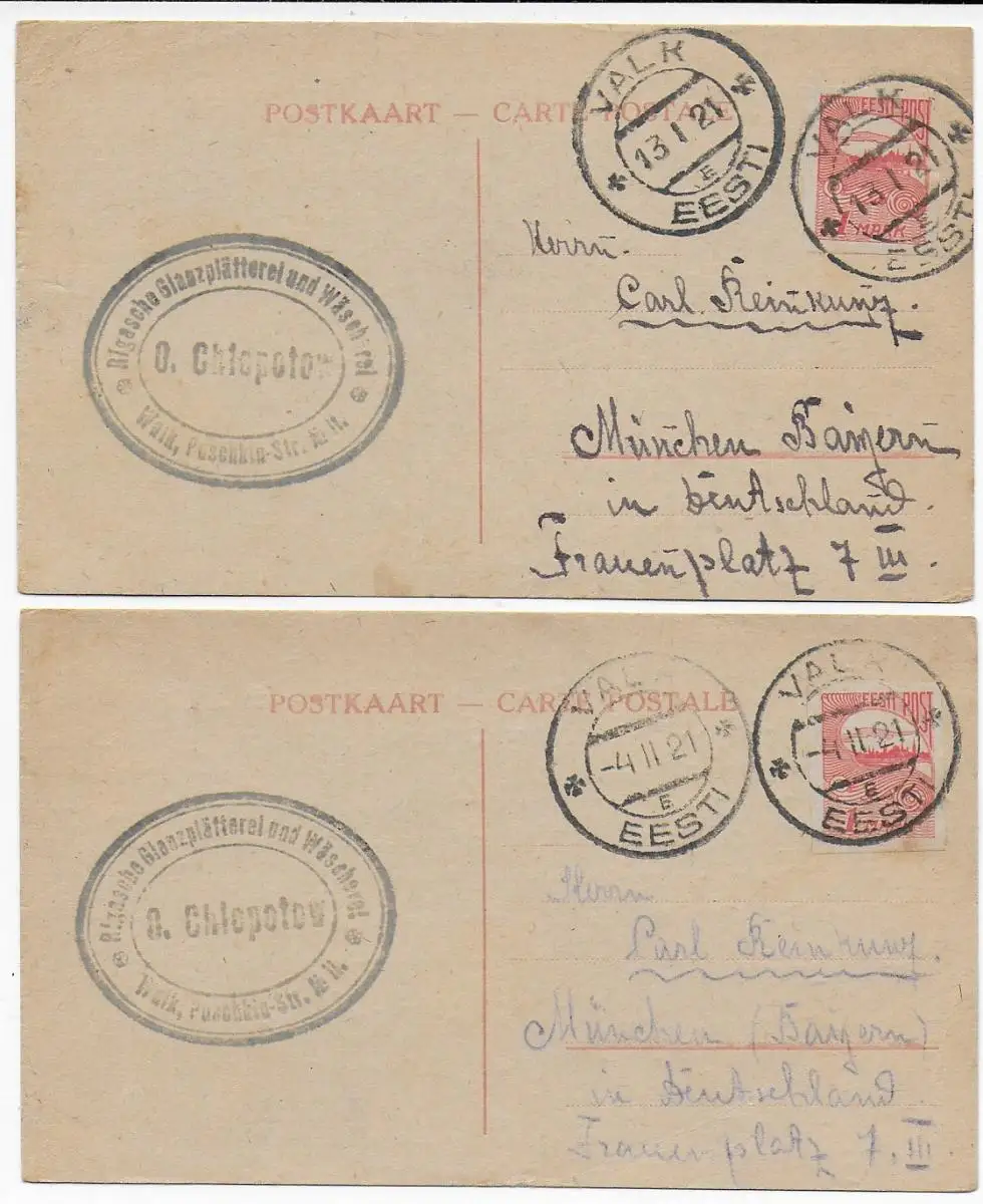 Estonie: 2x carte postale Waik/Valk, 1921 à Munich