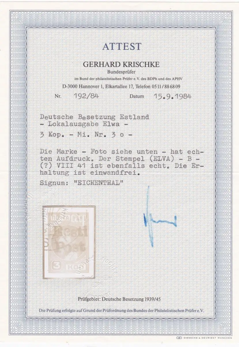 Estonie: édition locale Elwa, Min. 3, cacheté, BPP Attest