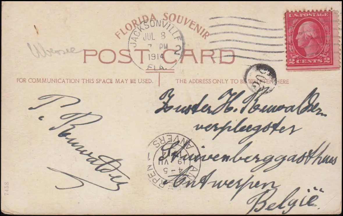 Floride Souvenir Post-Card de Jacksonville en Belgique, Tampon d'arrivée ANTWERPEN 19.7.14 Vérification: original Référence produit: 00000000033873