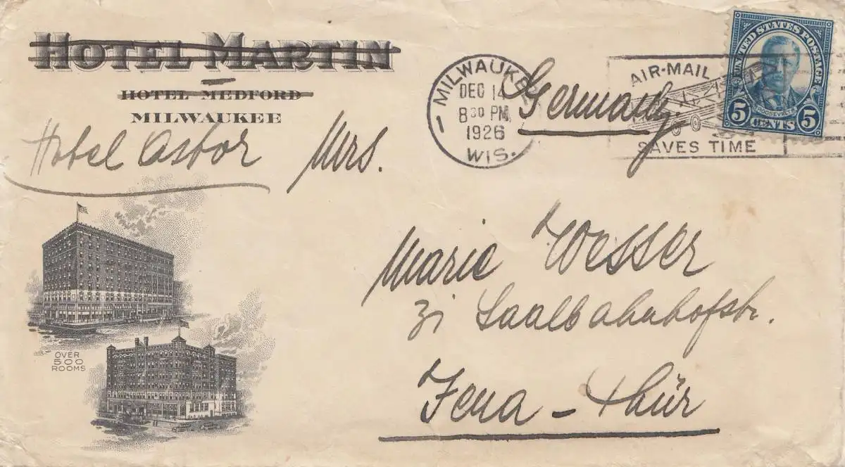 États-Unis d'Amérique 1926: Hotel Astor Milwaukee to Jena, Germany