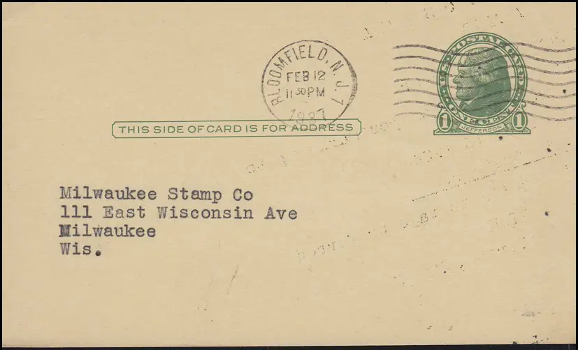 Etats-Unis entier Carte postale 1 cent Jefferson BLOOOIFMELD N.J. 12.2.1937 n. Milwaukee