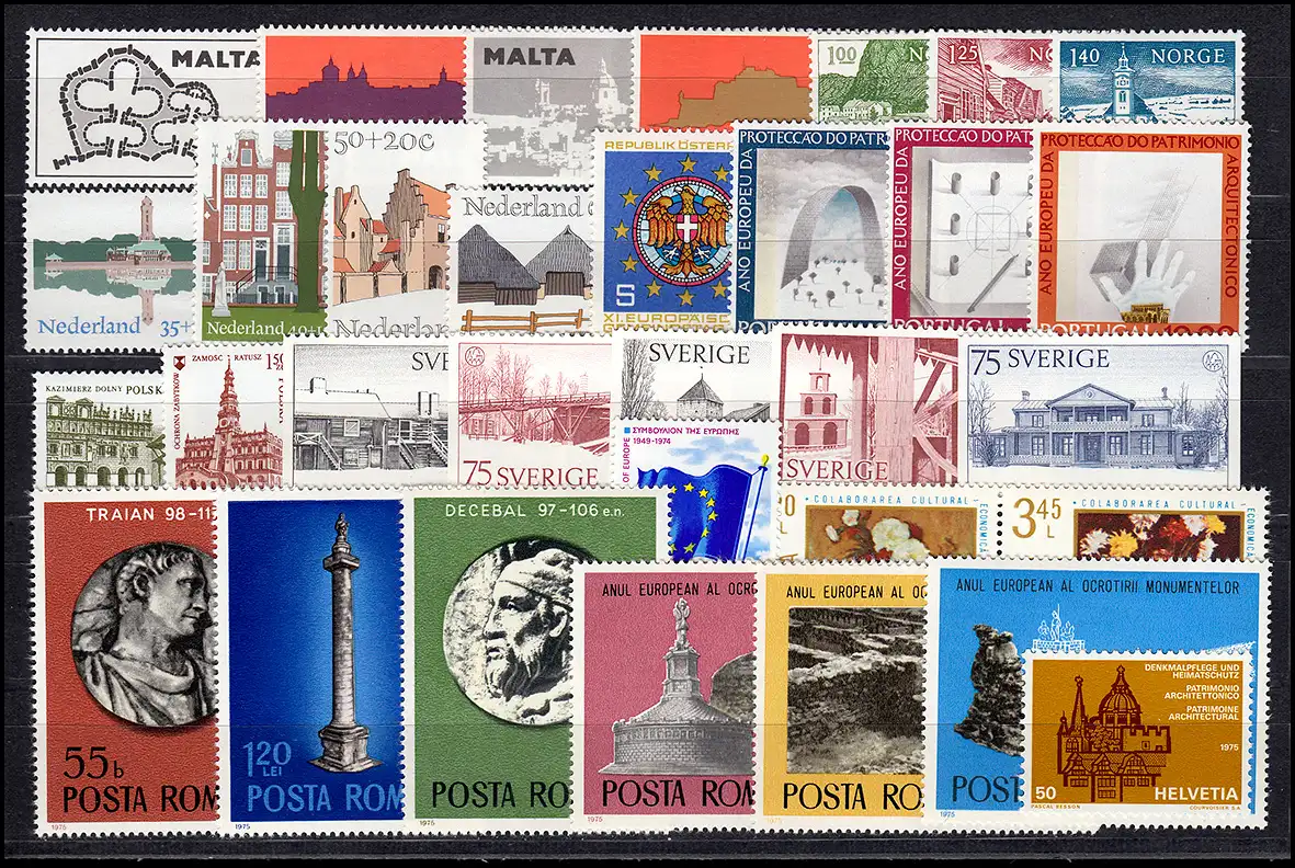 Tous les numéros principaux selon le catalogue MICHEL-CEPT sont complets avec 24 numéros de l'Année européenne de la protection des monuments 1975, avec le bloc de Roumanie 122. N° de catalogue: 1975 Examen: original Numéro d'article: 60700197500199
