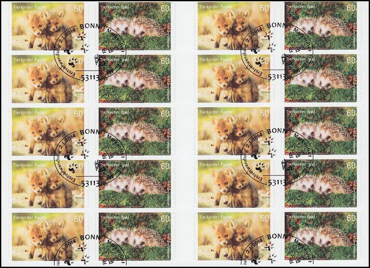 FB 36 Enfants d'animaux: renard et hérisson, feuille de 10x 3053-3054, EV-O Bonn