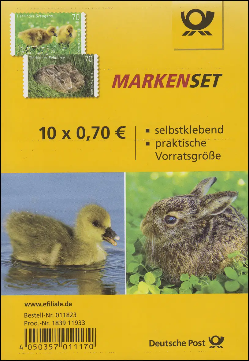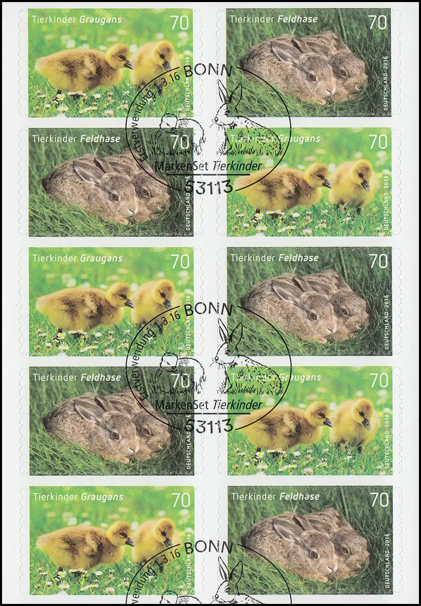 FB 55 Enfants d'animaux Graugans & Feldhase, feuille de 5x3222 + 5 x 3223, EV-O Bonn