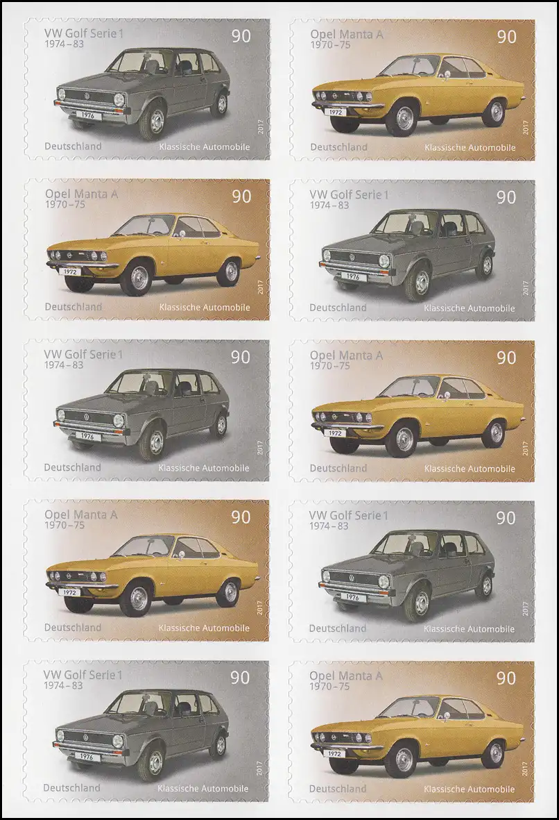 FB 66 Automobiles: VW Golf et Opel Manta, feuille de 5x3301 + 5 x 3302, **